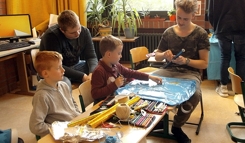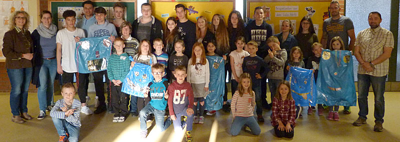 Seit Dezember treffen sich die Klassen 9cM und 1b regelmäßig, um zusammen zu singen, vorzulesen, zu basteln oder zu erzählen. So lag es nahe, gemeinsam das Projekt „Kids for Kitz“ in Angriff zu nehmen. Zunächst wurde geplant und vorbereitet. Schließlich entstanden aus Mülltüten, Glitzerpapier und Schnüren 20 Rehscheuchen, die Rehkitze vor dem Mähtod bewahren sollen. Am 7. April fand die Übergabe durch die Klassen und die Klassenlehrkräfte Frau Stadtmüller, Frau Nedrenco und Herr Metz an die Jäger, unter Führung von Frau Stenger statt.