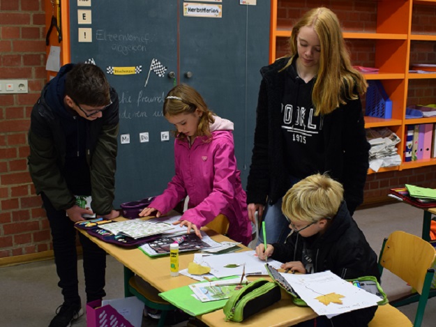 Die Schüler der 3b haben die Herbsttage genutzt, um auf dem Schulgelände bunte Herbstblätter, Zweige und Früchte zu sammeln. Diese wurden dann zu einem Kunstwerk arrangiert und stolz präsentiert. Anschließend halfen die Schüler der 8M als Mentoren den Grundschülern beim bestimmen der Bäume im grünen Pausenhof. Beide Klassen hatten viel Spaß bei der Zusammenarbeit.