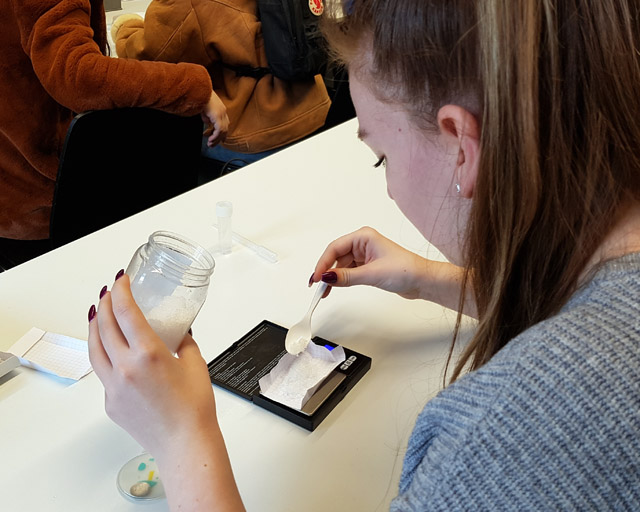 Im nächsten Labor (Bild siehe unten) wurden Goldteilchen ausgefällt und den Schülern erklärt, dass dieser Vorgang für die rote Farbe in alten Glasscheiben verantwortlich ist. Versuchsmaterial musste genau abgemessen und aus bestimmten Temperaturen gehalten werden.