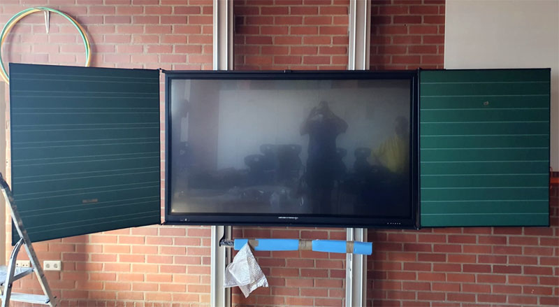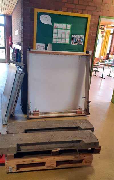 Die ersten Tafeln stehen. In der Grundschule mit Seitenflügeln, in der Mittelschule ohne. Dafür werden Whiteboards als "Schreibtafeln" angebracht.