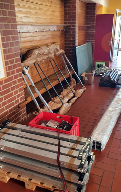 Nachdem die kleine Turnhalle seit ein paar Tagen als Zwischenlager für die angelieferten Komponenten der neuen digitalen Tafeln herhalten musste, werden die Kisten nun ausgepackt. Unsere Hausmeister haben begonnen die alten Kreidetafeln abzubauen, die Mitarbeiter der Firma HE-S montieren in der Mittelschule bereits die neuen Tafeln an die Wände. Schüler und Lehrer fiebern aus den Ferien dem Einsatz der Geräte entgegen. Bis alles reibungslos läuft, ist noch einiges zu tun.