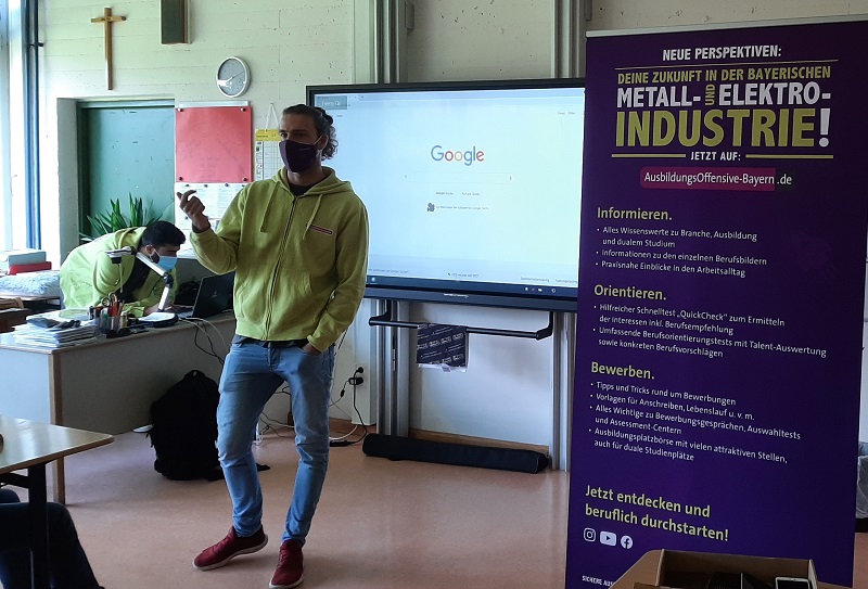 Am Dienstag, den 06.07.2021 waren 2 Mitarbeiter der Ausbildungsoffensive- Bayern, die extra aus Nürnberg zu uns gekommen sind, zu Besuch in unserer Klasse 8aM. Sie brachten uns die Berufe der bayerischen Metall- und Elektroindustrie näher und informierten uns über Inhalte der jeweiligen Berufe. Wir waren über die Vielfalt der Ausbildungsberufe sehr überrascht. Außerdem haben wir einen sogenannten „Quick Check“ -Bogen erhalten, mit dem wir unseren Wunschberuf besser herausfinden konnten. Wer weiß, vielleicht war doch für den ein oder anderen etwas Neues dabei.