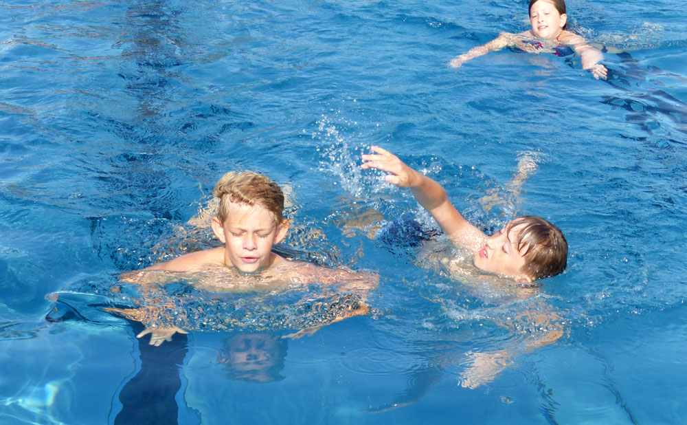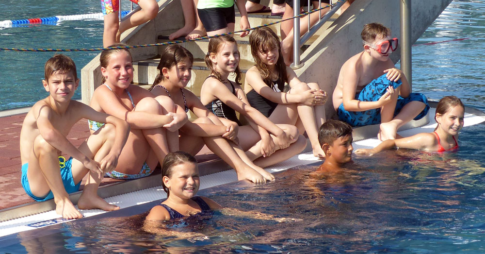 Schüler beim Schwimmen und Wasserspringen im Schwimmbad.