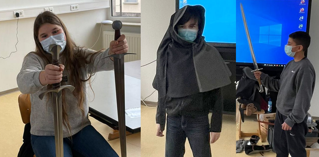 In der 4. und 6. Jahrgangsstufe steht das Thema Mittelalter an und die Schüler der KDS tauchen dann immer ab, ins Leben von Rittern, Bauern und Bürgern der Zeit. Mit Kisten voller mittelalterlicher Kleidung, Rüstungen und auch Waffen (da sind wir alle sehr, sehr vorsichtig!) zeigt Volker Knüpfing den Schülern Besonderheiten ("...wo sind die Hosentaschen?"), lässt anprobieren (z.B. ein Kettenhemd und Eisenhut) und holt Vorwissen aus dem Unterricht ab. Alltagsprobleme werden gelöst - wie kommen ich aus so einer Rüstung wieder raus! - und modische Trends des Mittelalters besprochen, denn "...der Stoff fühlt sich seltsam an." Wir hoffen alle hatten Spaß, auch die Lehrkräfte, und die Vergangenheit anschaulich erlebt.