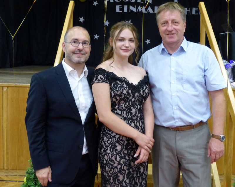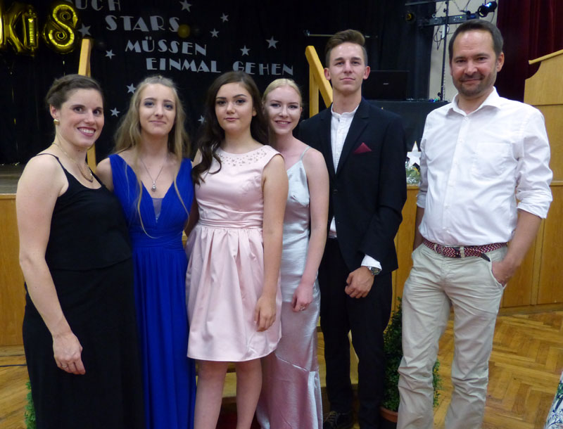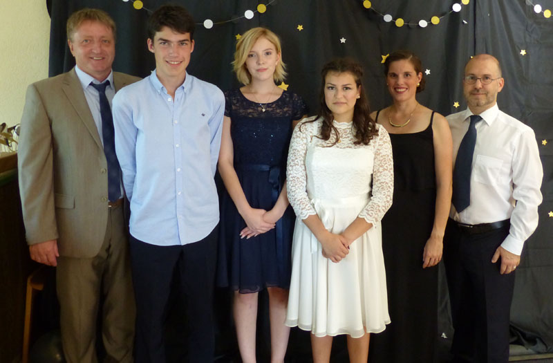 Die drei Abschlussbesten (von links nach rechts) Johannes Heinzl, Melissa Wagner und Nele Grünbeck, mit Schulleiter Horst Kern und den Klassenlehrern Julia Walter und Volker Knüpfing.