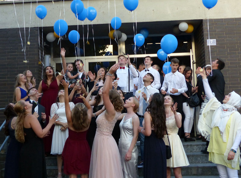 Am gestrigen Donnerstag wurden 51 Schüler der beiden 10. Klassen der KDS aus der Schule entlassen. Fünfzig von ihnen erreichten dabei das Ziel mittlerer Bildungsabschluss. "Auch Stars müssen einmal gehen" war das Motto der Feier. Sterne schmückten den Saal, eine "Wall of Fame" wurde angelegt, auf der jeder der Absolventen einen Stern mit einem persönlichen Logo hinterlassen hatte. Der Schulleiter Host Kern hob in seiner Rede nicht nur die schulischen Leistungen der Klassen hervor, sondern berichtete auch von sportlichen Erfolgen mit den Schulmannschaften, sozialem Engagement für das schulische Umfeld und den Einsatz für den Schülerlotsendienst. Die Schüler zeichneten Lehrkräfte in verschiedenen Kategorien aus. Die Klassenleiter Julia Walter und Volker Knüpfing ließen das Schuljahr aus dem Blickwinkel einer Filmproduktion Revue passieren. Bevor es zum geselligen Teil des Abends überging, ließen die Schüler noch einige Wunschballons steigen, mit dem Ausblick auf die Zeit nach der KDS in Ausbildung oder weiterführenden Schulen.