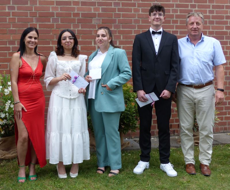 Prüfungsbeste des Jahrgangs 2021/22: Narjes O. (1,33) Göksu C. (1,56) und Sascha K. (1,89), eingerahmt von Konrektorin Susanne Baierl-Zachrau und Rektor Horst Kern.