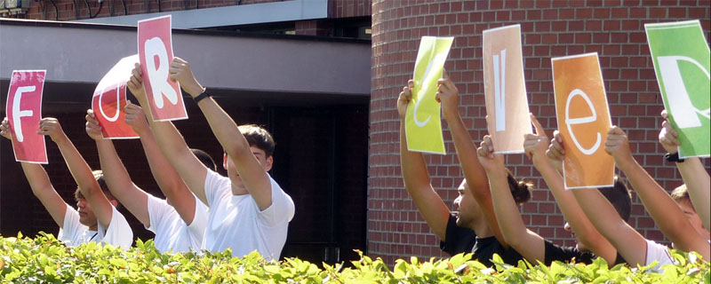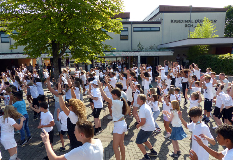 Nach über 30 Jahren als Schulsekretärin an der Kardinal Döpfner Schule, verabschiedet sich Anette Hein in den wohlverdienten Ruhestand. Alle waren sich einig - das Herz und die gute Seele unsere Schule, muss gefeiert werden. Für all die Pflaster und Eisbeutel auf dem angeschlagenen Schülerknie, für die Ruhe, die Anette in jeder noch so hektischen Situation ausstrahlte und die große Übersicht für die an der Schule anstehenden täglichen Aufgaben. Den Anfang machte ein Flash-Mob auf dem Pausenhof, vor Frau Heins Sekretariatsfenster. Die gesamte Schülerschaft stand plötzlich mit einem Tanz vor der Tür und eröffnetet die "Celebration".