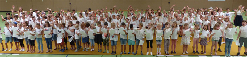 Nach der Aktion auf dem Pausenhof, zogen alle in die Turnhalle, wo einige Darbietungen auf unsere scheidende Sekretärin warteten: