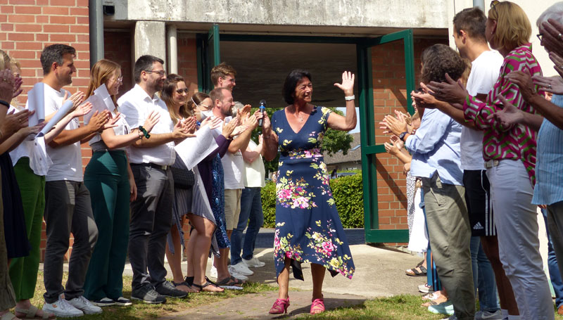 Im Kreis der aktuellen und ehemaligen Kolleginnen und Kollegen ging die Feier dann in kleinerem Kreis im grünen Pausenhof weiter. Schulleiter Horst Kern bedankte sich aufrichtig dafür, mit Anette Hein arbeiten zu dürfen und stelle ihr ein überragendes Arbeitszeugnis aus. Ludwig Adrian, als sein Vorgänger, konnte dies nur bestätigen und ergänzen. Glückwünsche zum Wechsel von der "Schulzeit in die Familienzeit" gab es auch von Seiten der Offenen Ganztagesschule und von den Bürgermeistern Niedernbergs und Großwallstadts. Das Kollegium der KDS verabschiedete sich mit zwei Ständchen. Zum Abschluss ließ Anette Hein nochmal einen Freitag vor über dreißig Jahren Revue passieren, an dem sie den Mut für die Bewerbung um die Stelle als Schulsekretärin aufgebracht hatte. Was für ein Glückstag für Großwallstadt und alle, die in den letzten dreißig Jahren mit ihr zusammenarbeiten durften.