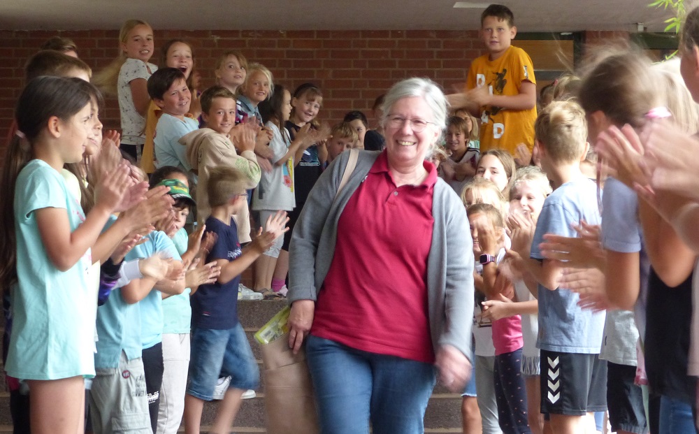 Beate Stadtmüller war an der KDS nicht nur in diesem Schuljahr die geschätzte "Alterspräsidentin". Kein anderer Kollege oder Kollegin war mit Stichtag Juli 2023 so lange an der KDS im Dienst wie sie, ganze 35 Jahre lang. Ursprünglich aus dem Bankgewerbe kommend, sattelte Frau Stadtmüller um und wurde Grundschullehrerin. Vor allem die Eingangsklassen waren ihr Schaffensraum und es dürfte wenige in Großwallstadt geben, die so oft auf Bildern mit Schultüten zu sehen sind. In ihrem letzten Dienstjahr war Beate Stadtmüller eigentlich als Mobile Reserve vorgesehen, hat aber dann die KDS nicht verlassen und am Ende die Klassenführung in der 2. Klasse übernommen. Wir verabschieden sie nun in den verdienten Ruhestand und wünschen Beate viel Zeit für die schönen Dinge im Leben, abseits der Schule. Auf unserem Einleitungsbild: Beate Stadtmüller bei der Ehrung für geleistete Arbeit und die Verabschiedung in den Ruhestand in der GS Elsenfeld, durch Schulamtsdirektor Ulrich Wohlmuth und auf dem Artikelbild mit Spalier der gesamten Grundschule.