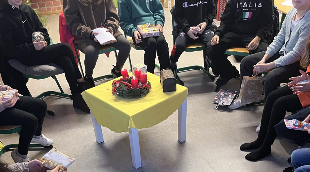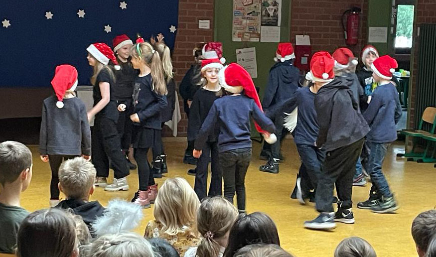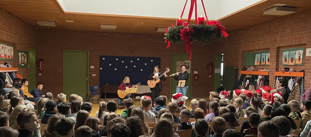 Die Grundschüler der KDS haben heute nach der ersten Pause gemeinsam Weihnachten gefeiert. In den Klassen gab es gemeinsames Plätzchen-Essen, Frühstücken und Wichteln. Für Unterhaltung sorgten Geschichten und Lieder. Gemeinsam hat man dann auch in der Aula gesungen: Das "Feliz Navidad" war vielleicht sogar bis hinüber in die Mittelschule zu hören.