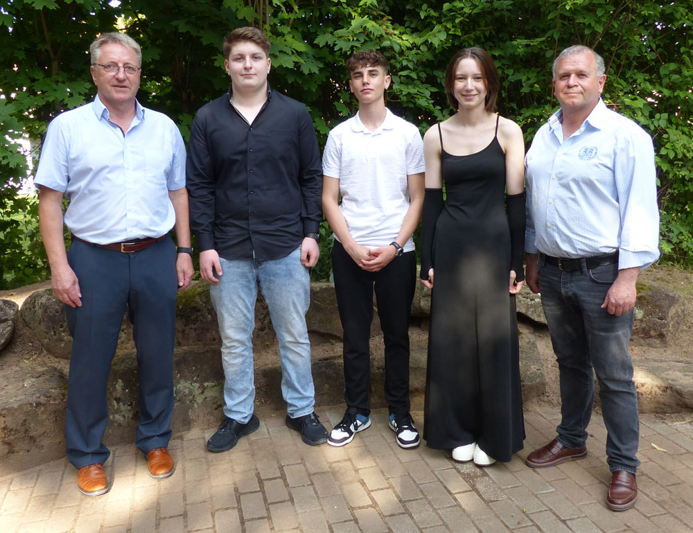Die drei Prüfungsbesten, eingerahmt von Schulleiter Horst Kern und Klassenleiter Uwe Keßler