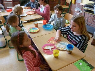 Als der Teig schließlich fertig war, wurden die Waffeleisen aufgebaut. In der Zwischenzeit verteilten die Viertklässler Getränke an ihre Gäste. Voller Vorfreude kamen die Paten mit ihren Patenkindern nach vorne und bucken ihre Waffeln heraus. Jetzt fehlte nur noch das Bestäuben mit Puderzucker und schon ging es zurück an den Sitzplatz. „Hm, schmecken die lecker!“, lobten die Erstklässler. Auch die Viertklässlern waren rundum zufrieden mit ihren Waffeln. Für manch einen Schüler war auch erst nach der siebten Waffel Schluss. „Ich bin fast ein bisschen stolz, dass wir das so gut geschafft haben!“, freute sich eine Schülerin, nachdem die Patenkinder wieder gegangen waren.