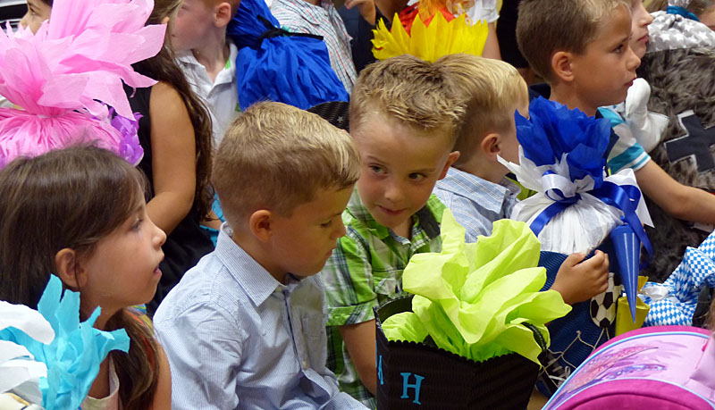 , so dass die Kinder mit den Lehrerinnen Beate Stadtmüller und Angela Ehemann in die Klassen gehen konnten. Den Abschluss des Tages bildeten dann die fliegenden Schultüten an den bunten Luftballons.