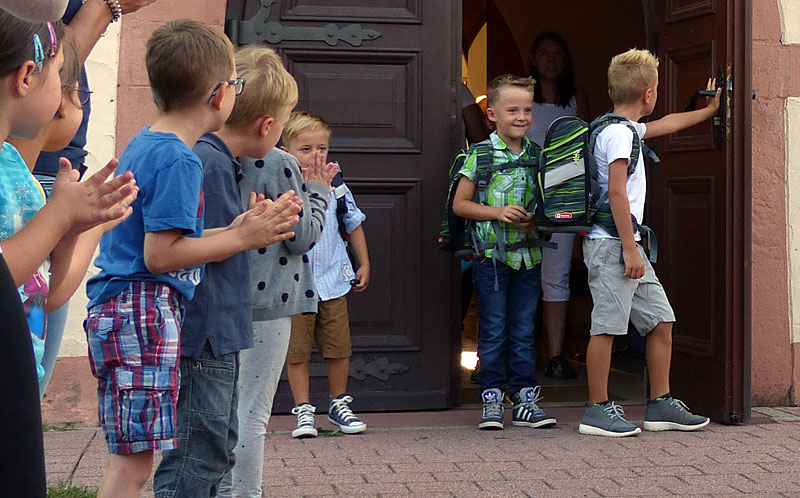 So ein erster Schultag ist aufregend, für die Kinder, deren Eltern und die Lehrer. Alles begann mit dem Gottesdienst, bei dem die neuen Schüler der KDS gleich etwas wichtiges lernten: "Ich bin bei dir!" Das das ab jetzt nicht nur Mama und Papa sind, sondern mit göttlichem Segen auch die Mitschüler, die Lehrer und die Schulgemeinschaft der KDS, war für "Kleinen" ein erster Schritt im neuen Schuljahr 2016/17. Bevor es in die Schule ging, wurden die Erstklässler noch von ihren ehemaligen Kameraden aus dem Kindergarten verabschiedet, die ihnen kräftig zuwinkten. Mit großen Augen, manche etwas unsicher, andere voller Vorfreude versammelte man sich in der Aula und schickte Mama und Papa dann "endlich zum Kaffee trinken"