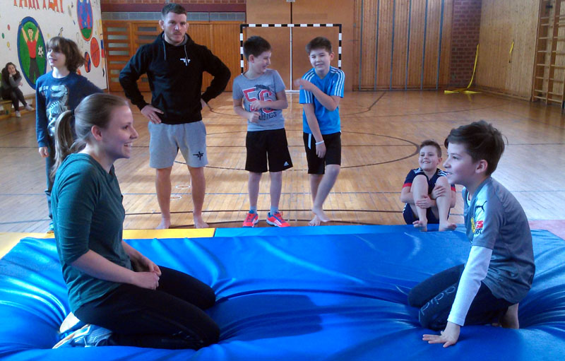 Das Ringen und Raufen Projekt mit der Janusz Korczak Schule, bei dem unsere Mittelschüler unter Anleitung von Lukas Fecher engagiert sind, ist nicht die einzige Gelegenheit für die Schüler sich auszutoben. Zusammen mit der JAS Frau Bock und den Klassenlehrerinnen der 4. Klassen kamen auch die Grundschüler in den Genuss eine mehrwöchigen Workshops zum Thema "Raufen". Nachfolgend zwei Bilder der Aktion.