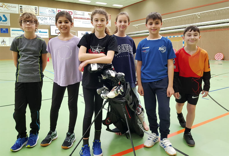 Die Schüler der Grundschule konnten heute an einem Schnuppertag zum Thema Golf teilnehmen und haben in der großen Turnhalle heute engagiert die Schläger geschwungen. Wir hoffen alle hatten viel Spaß bei der Aktion. Auf unserem Bild sind die Schüler der 3b zu sehen, komplett mit Golftasche.