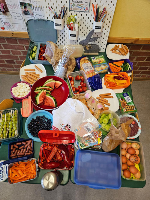 Die Klasse 1b hat heute ein gesundes Osterfrühstück gemacht, mit ganz viel Obst, Gemüse und auch ein paar Würstchen und Eiern. Alle Kinder wurden satt, denn den Vormittag über konnte man sich an einem Büfett bedienen. Die Schülerinnen und Schüler haben auch gerne ihre Speisen mit den anderen Grundschulkindern geteilt. Auch in der Mittelschule gab es was zu Essen, ob ähnlich gesund und lecker war nicht zu erfahren, wir denken aber schon.