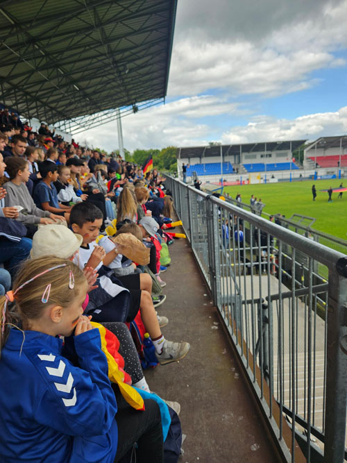 Am Dienstag fand im Stadion am Schönbusch ein U16 Fußballspiel der Frauen gegen die Auswahl aus den USA statt. Die seit der der EM 2011 Frauenfußball erprobte KDS hat zahlreiche Fans aus der Grund- und Mittelschule ins Stadion gefahren, um unser Team kräftig anzufeuern. Das Spiel hat die deutsche Auswahl leider mit 4:2 verloren, aber unsere Schüler haben sich für den Start des Turniers der Männer Ende der Woche schon mal warm gejubelt. Im Bereich Fußball stehen für die Grundschule nach dem Schulhaus internen Turnier bald weitere Spiele im Landkreis an.
