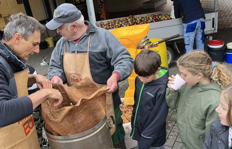 Beim diesjährigen Apfelfest wurden, in Zusammenarbeit mit dem Obst- und Gartenbauverein Großwallstadt wieder jede Menge Apfelsaft gepresst und vor Ort, frisch aus der Presse getrunken. Die Äpfel wurden letzte Wochen von den den Schülern selbst auf den Streuobstwiesen gesammelt. So schmeckte der Saft noch viel besser! Ein paar Apfelkuchen gab es auch noch und durstig ging keiner an diesem Tag nach Hause.