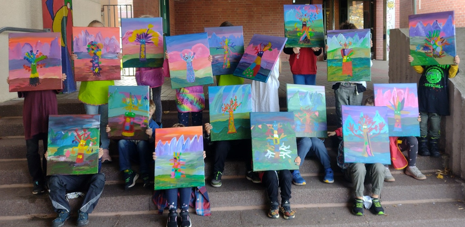 Die Klasse 1b durfte in der letzten Woche vor den Herbstferien unter der Anleitung von Frau Leuner vom Kunstnetz Miltenberg 3 Tage lang mit Acrylfarben ihre eigenen Zauberbäume auf Leinwände malen. Dabei hatten die Kinder viele tolle Ideen. Mit großem Eifer waren alle dabei. Die entstandenen farbenfrohen Kunstwerke werden im Schulhaus aufgehängt und können dann von allen Schülern und Besuchern der Schule bewundert werden.