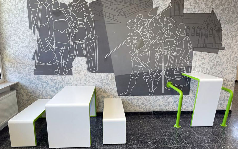 Die neuen Möbel für das Schulhaus Niedernberg sind eingetroffen und werden aufgestellt. Bei den Klassenzimmermöbeln haben wir auf modulare Tische gesetzt, die sich zu beliebig großen Gruppentisch-Inseln zusammenstellen lassen. Es kann also allein oder in Teams gearbeitet werden und der Umbau ist unkompliziert. Auf Stauraum mit Materialfächern für die Schüler ist bei der Planung auch geachtet worden, um Ordnung im Klassenzimmer zu halten (siehe Beitragsbild). Im Treppenhaus, vor dem Wandgemälde findet sich eine kleine Sitzecke (siehe Einleitungsbild). Wir liefern demnächst noch ein paar weitere Eindrücke nach.