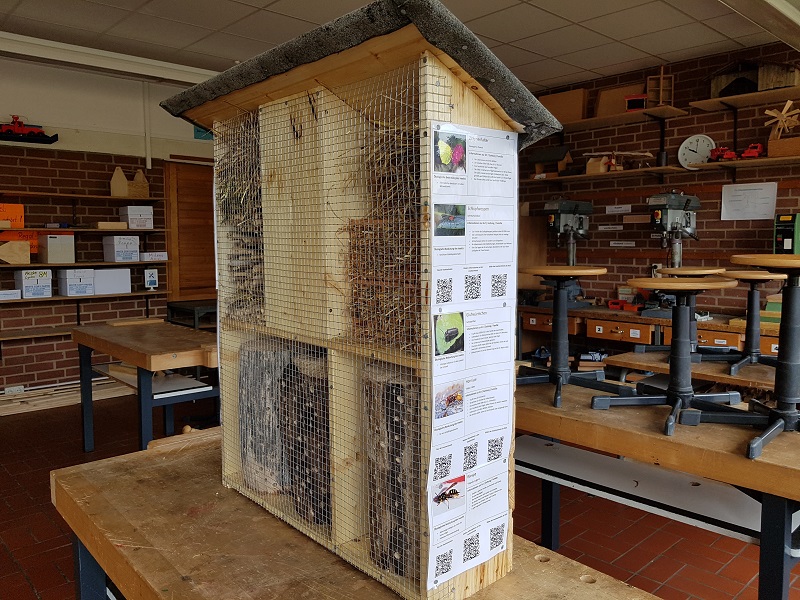 Im Rahmen der Alltagskompetenzen- und Nachhaltigkeitswoche in der 8M wurden vier große Insektenhotels gebaut. Im Technik-Unterricht haben die Schüler das Hotel aus Holz geplant und gebaut. Im Computerraum wurden Steckbriefe zu Insekten erstellt, eine Infoflyer entworfen und eine Internetseite verlinkt, auf der mit einem QR-Code weitere Informationen zum Projekt aufgerufen werden können. In Soziales haben sich die Schüler mit dem regionalen Produkt des Apfels beschäftigt. Über die Standorte, an denen die Insektenhotels in Niedernberg und Großwallstadt aufgestellt werden, ist noch nicht entschieden.