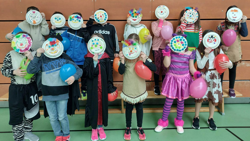 Vor den Faschingsferien hatten die Schüler der 4b noch Spaß mit einem Maskentyp, der zwar nicht Corona-Konform ist, aber viel mehr Spaß macht, als die üblichen Mund-Nase-Bedeckungen der letzten zwei Jahre (die aber natürlich zusätzlich getragen wurde). Die Pappmasken waren selbst gebastelt und dann gab es noch Spiel und Spaß in der Turnhalle mit "Kamelle" am Ende. Die 4b ruft "Helau!" und wünscht allen ein paar gute freie Tage.