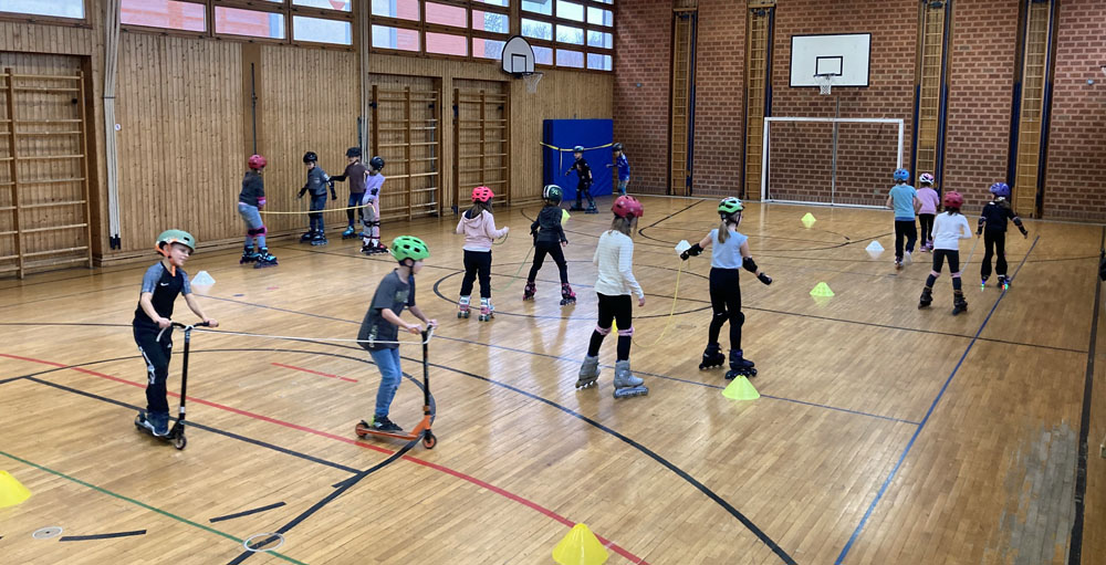Die Klasse 3b hat heute begonnen, sich auf den Eislauftag vorzubereiten. Dafür üben die Schüler im Sportunterricht das Inliner & Rollschuhfahren. Dabei stehen Sicherheit und Geschicklichkeit zunächst im Vordergrund. Die Kinder trainieren dabei das richtige Bremsen, Kurvenfahren, Slalomfahren und machen Gleichgewichtsübungen. Natürlich kommt dabei der Spaß auch nicht zu kurz.
