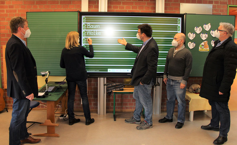 Als Vertreter des Sachaufwandsträgers für die Kardinal Döpfner Grund- und Mittelschule besichtigte der Großwallstädter Bürgermeister Roland Eppig heute vor Ort den Digitalausbau in den Klassenzimmern und ließ sich die neuen Tafeln zeigen. Wie wir bereits berichtet haben, ersetzen diese in allen Klassenzimmern die Kreidetafeln. Mehr als nur "Schreibgerät", haben die Tafeln Anschluss an das Internet und damit direkten Zugriff auf Lernportale und Wissensdatenbanken. Zusammen mit den Dokumentenkameras ersetzten sie auch die analogen OHP-Geräte in den Klassenzimmern. Der Lehrer kann, z.B. ein Schülerheft unter die Kamera legen und der Klasse direkt ein schön gestaltetes Arbeitsblatt zeigen. Auch ist eine drahtlose WiFi-Verbindung von mobilen Geräten zur Tafel problemlos möglich. Alles was an der digitalen Tafel steht, kann gespeichert und z.B. am nächsten Tag wiederverwendet werden.