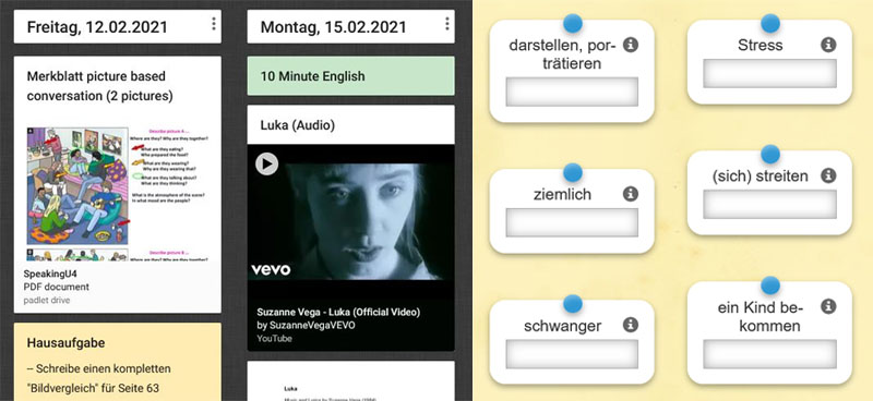 Weitere Möglichkeiten eröffnen sich durch "Padlets", auf denen die Lehrer einiger Klassen Nachrichten und Arbeitsmaterial für die Schüler hinterlassen. Diese "schwarzen Bretter" erreichen die einzelnen Schüler über einen Internet-Link und können so auf Hausaufgaben, begleitende Arbeitsblätter, Audio- und Videodateien, sowie Links und Apps zugreifen.