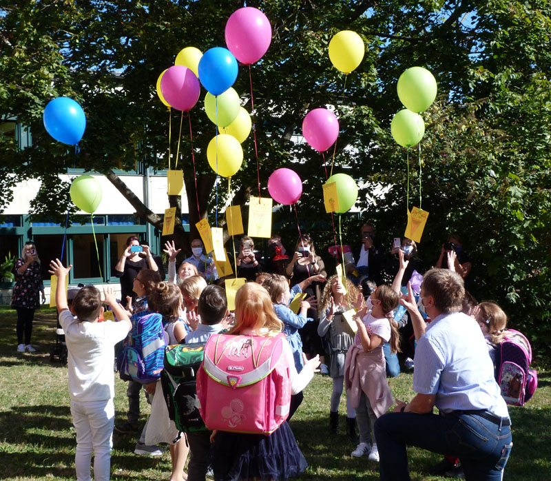 Unter dem Thema des "Regenbogens" fand für die neuen Erstklässler der Klassen 1a und 1b zunächst eine Einführung in der Turnhalle statt. Die neuen Schüler zeigten stolz ihre Schultüten vor und holten sich einen der traditionellen Ballons ab, der im gründen Pausenhof auf die Reise geschickt wurde. Wir hoffen alle, dass die Schüler einen schönen ersten Schultag hatten. Die Stimmung und das Wetter spielten, trotz Abstandregeln, mit.