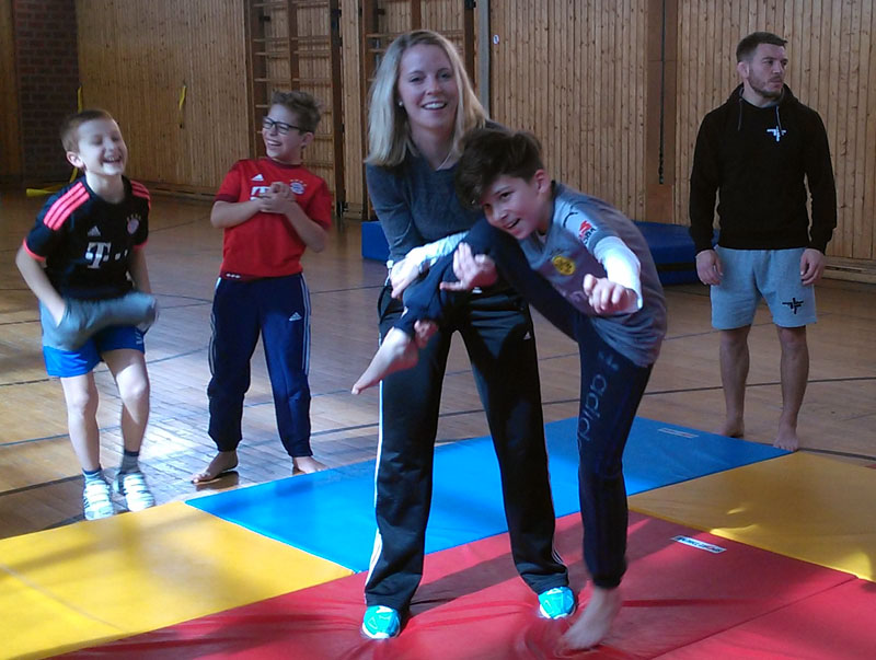Das Ringen und Raufen Projekt mit der Janusz Korczak Schule, bei dem unsere Mittelschüler unter Anleitung von Lukas Fecher engagiert sind, ist nicht die einzige Gelegenheit für die Schüler sich auszutoben. Zusammen mit der JAS Frau Bock und den Klassenlehrerinnen der 4. Klassen kamen auch die Grundschüler in den Genuss eine mehrwöchigen Workshops zum Thema "Raufen". Nachfolgend zwei Bilder der Aktion.