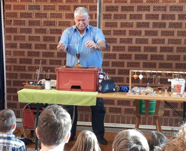 Aufmerksam lauschten die Schüler der Kardinal – Döpfner - Grundschule den Worten des Glasbläsers, als er ihnen die Zusammensetzung, die Entstehung und das Färben von Glas erklärte. Es entstanden eine Vase, ein bunter Schwan und eine silberne Geige. Richtig spannend wurde es, als Kinder selbst mithelfen durften. Ein Trickglas und ein „Spaßvogel“ riefen herzhafte Lacher hervor. Als es zwei Schülern gelang eine Kugel aufzublasen, wurden sie mit Beifall belohnt.