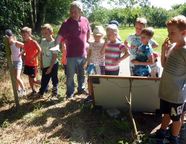 Nach einer anstrengenden Wanderung erreichten wir unser Ziel am Waldrand, die Ameisenhügel. Die beiden Ameisenexperten und –schutzwarte Herr Kern und Herr Krüger warteten dort schon auf uns. Sie hatten verschiedene Naturspielstationen im Vorfeld aufgebaut und ihre Infoplakate zur Ameise positioniert.