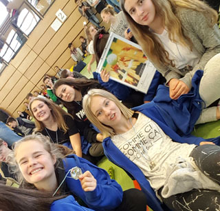 Seit Dezember treffen sich die Klassen 9cM und 1b regelmäßig, um zusammen zu singen, vorzulesen, zu basteln oder zu erzählen. So lag es nahe, gemeinsam das Projekt „Kids for Kitz“ in Angriff zu nehmen. Zunächst wurde geplant und vorbereitet. Schließlich entstanden aus Mülltüten, Glitzerpapier und Schnüren 20 Rehscheuchen, die Rehkitze vor dem Mähtod bewahren sollen. Am 7. April fand die Übergabe durch die Klassen und die Klassenlehrkräfte Frau Stadtmüller, Frau Nedrenco und Herr Metz an die Jäger, unter Führung von Frau Stenger statt.