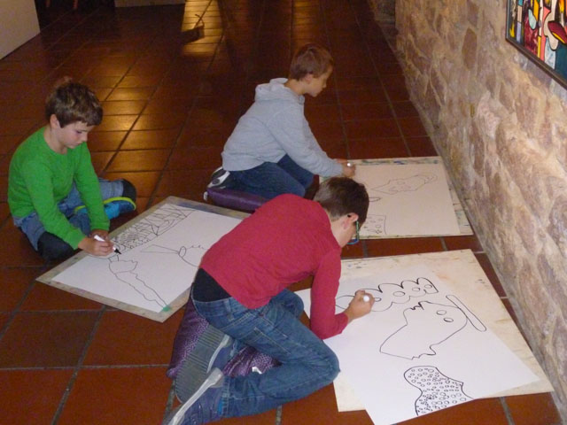 Am 30.September besuchten die zweiten Klassen die Ausstellung "Malen & Leben" in der Kochsmühle in Obernburg. Dort sind anlässlich des 75. Geburtstages von Otmar Alt viele seiner neueren Werke ausgestellt. Frau Bertlwieser und Frau Fieger, die beide zum Leitungsteam des Kunstnetzes gehören, erzählten kurz aus dem Leben des Künstlers. Danach betrachteten sie mit den Kindern ausgewählte Bilder wie z.B. "Die Sternenfängerin" und brachten ihnen die abstrakte,
