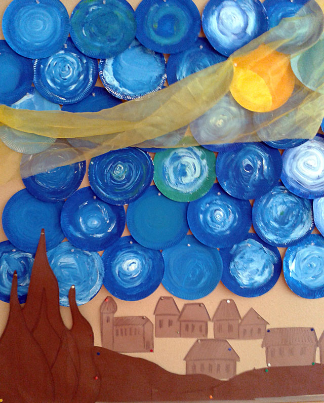 Das erste Bild aus der Reihe Schulhaus-Kunst macht diese Gruppenarbeit aus der 7. Klasse, bei der nach einer Bildbetrachtung von Vincent van Goghs "Sternennacht,"eine Vielzahl von mit blauer und weißer Abtönfarbe bemalten Papptellern entstand. Die einzelnen Himmelselemente wurden an eine Pinwand gehängt, die Dorflandschaft im Vordergrund wurde aus Tonpapier ergänzt. Das bunte Tuch gibt der Collage den letzten Schliff.