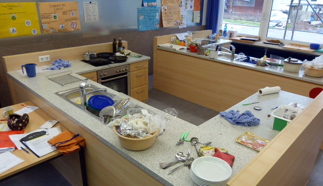 Die drei neunten Klassen haben diese Woche ein Probeprojekt zur Vorbereitung auf die anstehende QUALI-Prüfung durchgeführt. Das beigefügte "Tatort-Foto" zeigt unsere Schulküche am Ende des praktischen Prüfungstags.